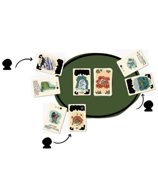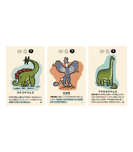 全員が手番を一度行い、一番小さな数字の災害カードを持っている人がHPを1点失います。ただし、恐竜たちはそれぞれ固有の能力を持っており、災害カードの効果との組み合わせによって、最小値が繰り上がったり、HPを2点失ったり、強い数字が0扱いになったりするため、選んだ数字が大きいから生き残れるとは限りません。誰かの恐竜のHPが0になったら、その時点で生き残っていたプレイヤーが全員勝利となります。なんとかしてピンチを乗り切り、少しでも長く生き残りましょう!