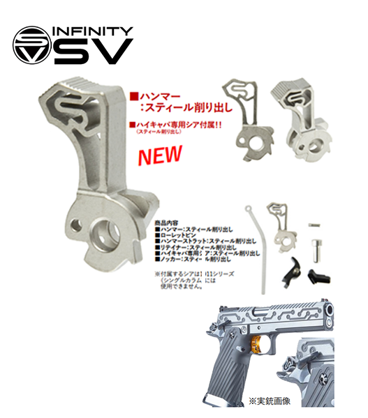 東京マルイ製ガスブローバックガン M1911シリーズに対応した、Infinityアームズ(SV Infinity)タイプのハンマーとシアのセットです。