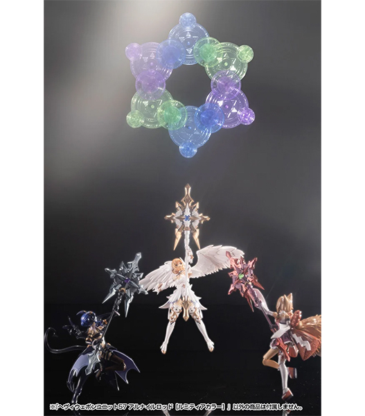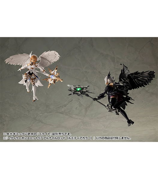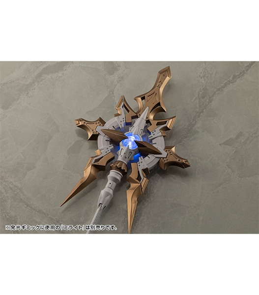 組み換えにより、槍や鎌、装甲など様々な武装形態に変化可能な『アルナイルロッド』は別売りのミライト(LED付リチウム電池)を組み込むことで中央基部のコアを発光させることが可能です。付属の魔法陣型エフェクトパーツはそれぞれ大きさや形状が異なり、中央に3mmジョイントが設けられているため、お好きなシーンを再現したり、ロボットメカのアクセントパーツとして使用するなど、幅広いカスタムをお楽しみいただけるアイテムとなっています。