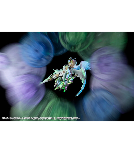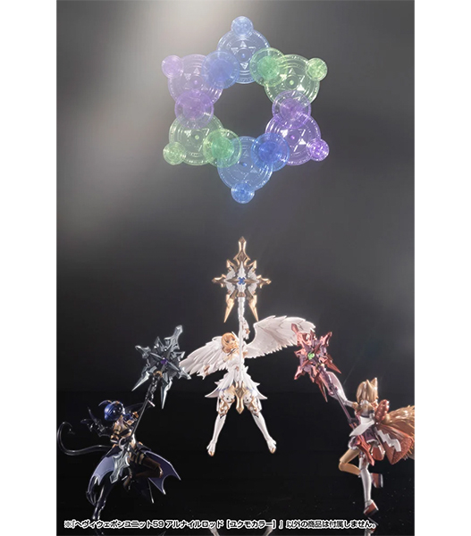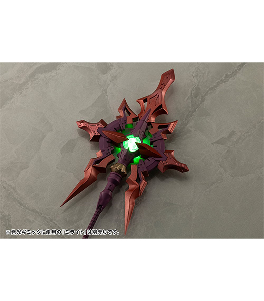 組み換えにより、槍や鎌、装甲など様々な武装形態に変化可能な『アルナイルロッド』は別売りのミライト(LED付リチウム電池)を組み込むことで中央基部のコアを発光させることが可能です。付属の魔法陣型エフェクトパーツはそれぞれ大きさや形状が異なり、中央に3mmジョイントが設けられているため、お好きなシーンを再現したり、ロボットメカのアクセントパーツとして使用するなど、幅広いカスタムをお楽しみいただけるアイテムとなっています。