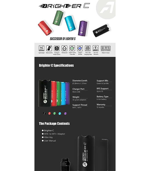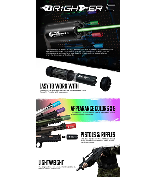ACETECH Brighter C は、エアソフトガン/モデルガン向けに設計された最小最軽量クラスのトレーサーユニットです。