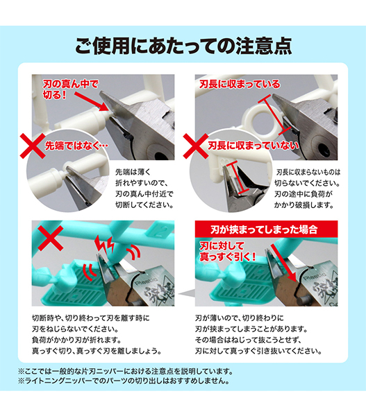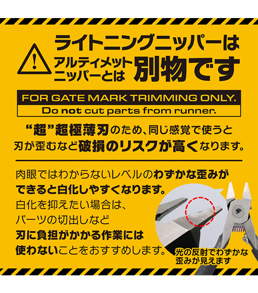 切れ味をさらに追求した”超”超極薄片刃構造により、これまで以上に軽い力でゲートカット!ライトニングニッパーはプラモデルのゲートカットに特化したニッパーです。