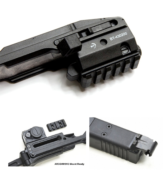 フレームのアンダーマウントレールから立ち上げる構造で、ダストカバー下にはピカティニー規格レールマウント、上面後部にはAimpoint ACROミニドットサイトを直接装着が可能です。※加工が必要になる場合もあります。