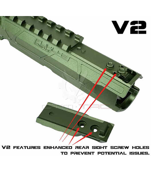 CTM TACV2では、リアサイトのネジ穴部分を強化することで、ネジ周りのトラブルや破損リスクを軽減しています。