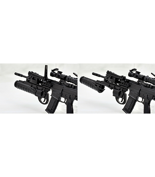 アドオン式グレネードランチャーはガン本体への着脱が可能で、開放・閉鎖状態は選択可能。ランチャー用照準器は起倒選択式。