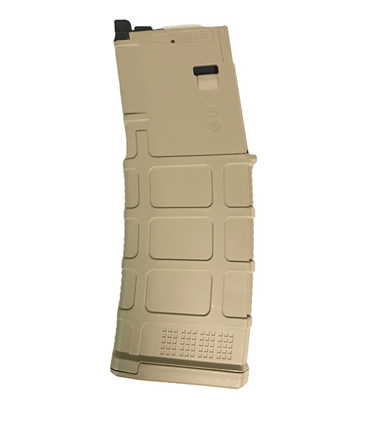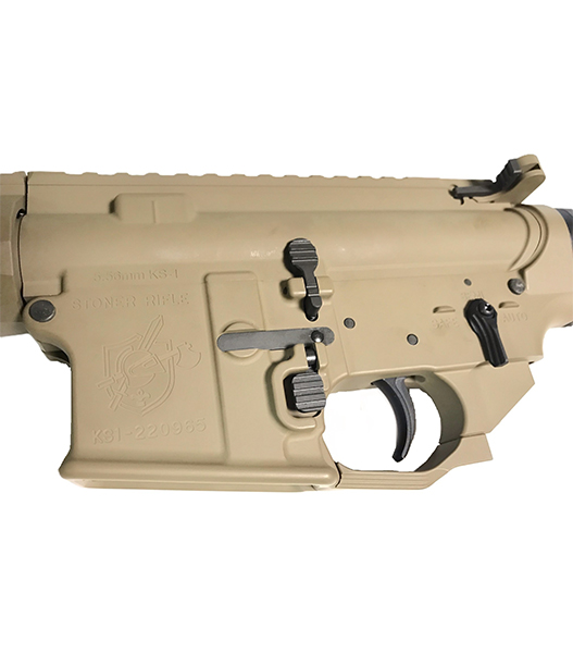 イギリス軍で「L403A1」として採用されたKS-1ライフルの外観や仕様を忠実に再現。特徴的な刻印が施されたレシーバーやハンドガード、バレル、マズルデバイスを備え、FDEカラーのセラコート塗装が施されています。