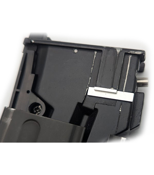 マガジンアシストはマガジン側に設置するパーツとなり、マガジンキャッチが掛かる部分の肉厚を物理的に上げてくれます。まずは無加工の状態で付けてみて、高さが高過ぎるようであれば、マガジンアシスト側を削り微調整してください。
