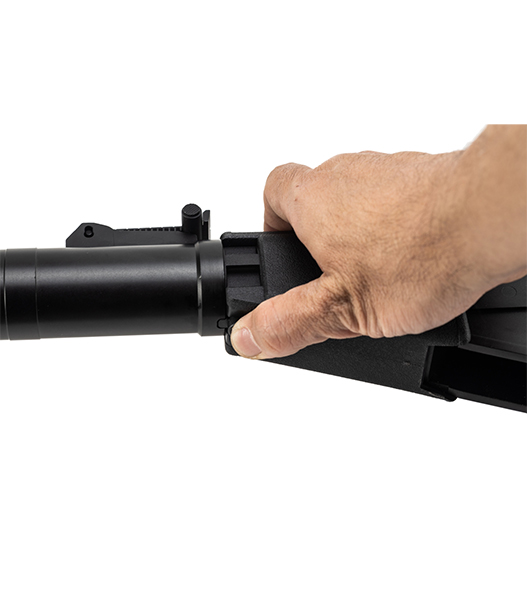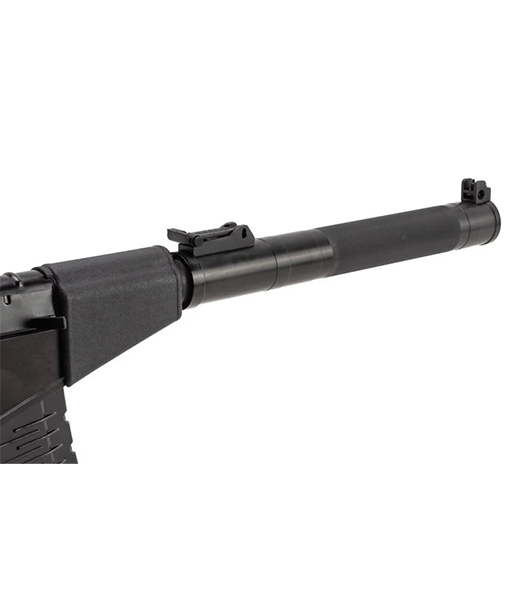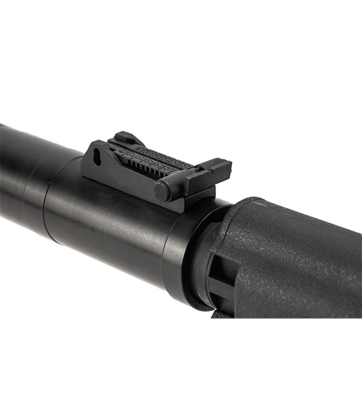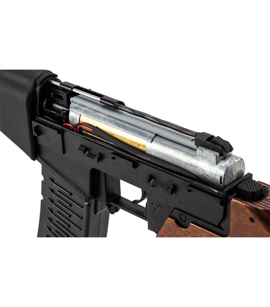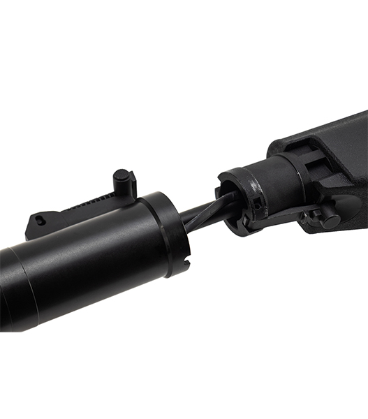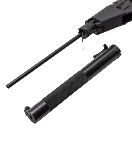 その内部はバッテリー収納スペースになっている。スチールプレス製のダストカバーと、サイドレールを備えたダイキャスト製のレシーバーも無骨なフォルムをしっかり再現。内蔵された7mmベアリング軸受採用のメカボックスはMOSFET搭載で、良好なトリガーフィールを実現。