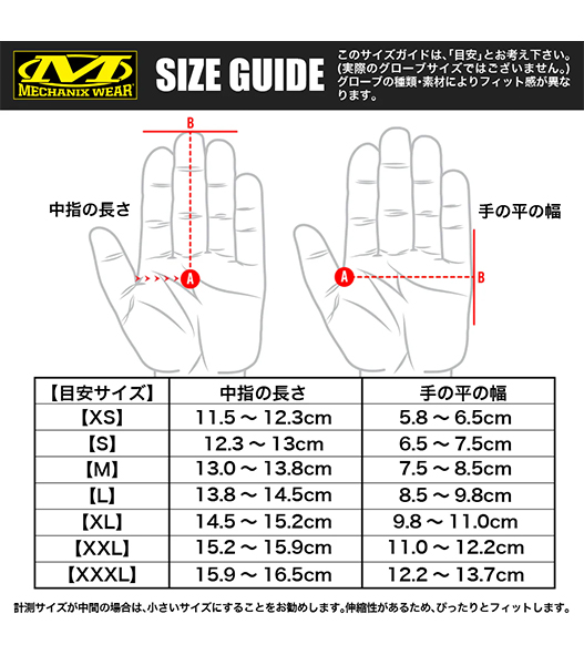 【XS】中指の長さ:11.5〜12.3cm、手の平の幅:5.8〜6.5cm