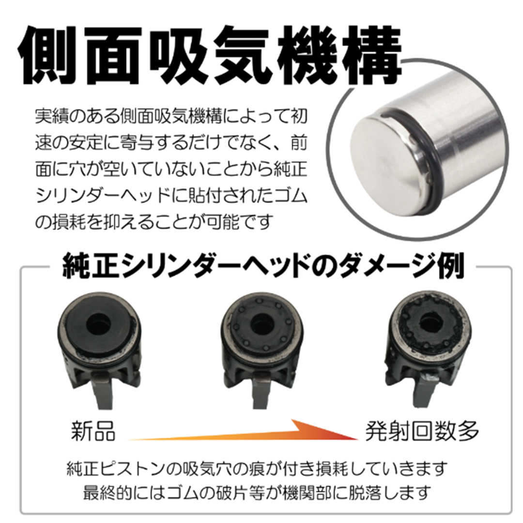 さらに、GDR-15の場合は純正ピストンに空いている「吸気穴」がシリンダーヘッドのゴムを傷つけてしまうことが御座いますが、側面吸気ピストンは正面に穴が存在しないことからシリンダーヘッドの長寿命化にも貢献いたします。
