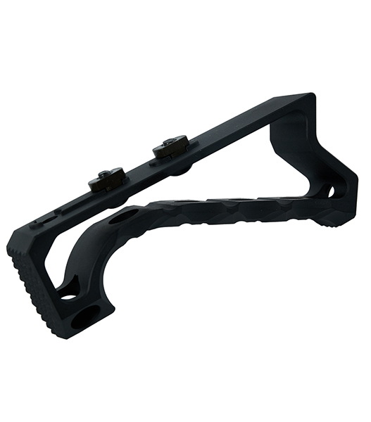 従来の様な垂直型ではなく、絶妙な角度付けでハンドガードを握るサポートハンドの疲労軽減と