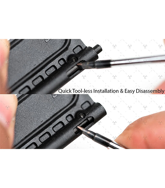 アッパーレシーバーの摩耗に応じた調整が可能です。SI特許出願中のノイズ低減ゴムパッドにより、作動時の音をほぼ100%カットします。