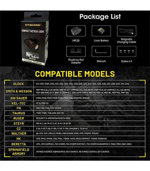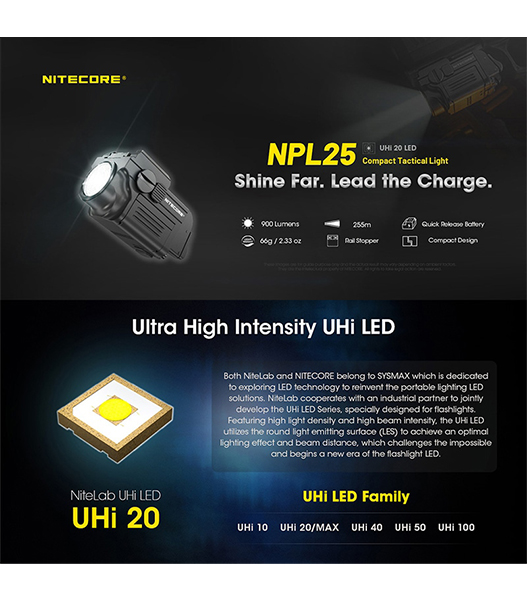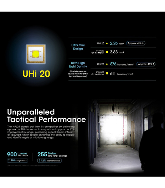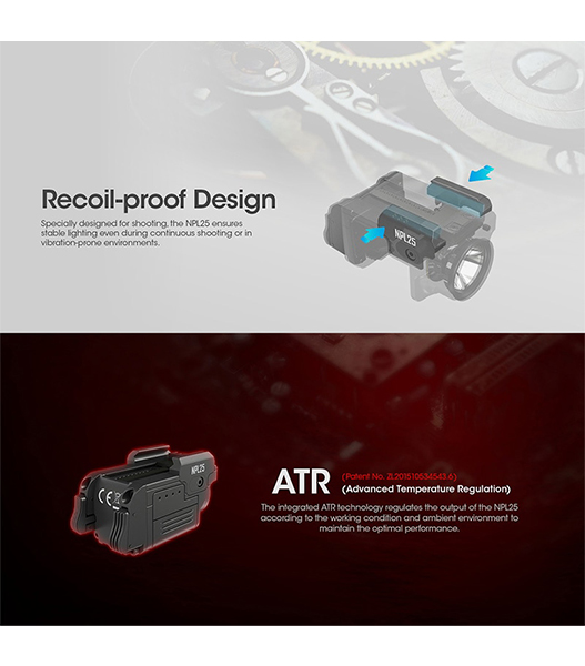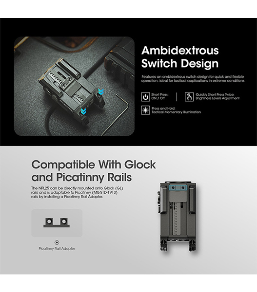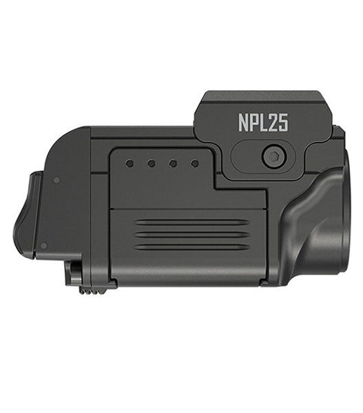 NITECORE製NPL25は、UHi 20 LEDを搭載したコンパクトタクティカルライトです。最大900ルーメンの高出力と255mの照射距離を実現しながら、Glockのアンダーレールやピカティニーレールに対応する超小型設計を採用。アンビデクストラス(左右両対応)スイッチ、耐反動構造、ATR(温度制御)を備え、ハンドガン搭載時でも安定したパフォーマンスを発揮します。