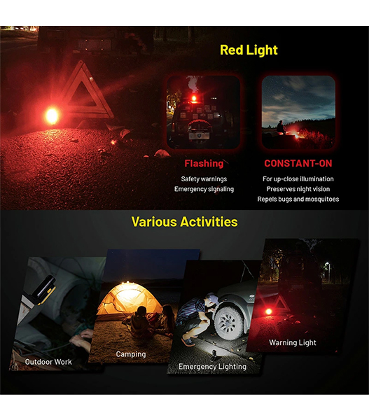 ・5段階の明るさ調整+赤色点灯/赤色点滅モード搭載