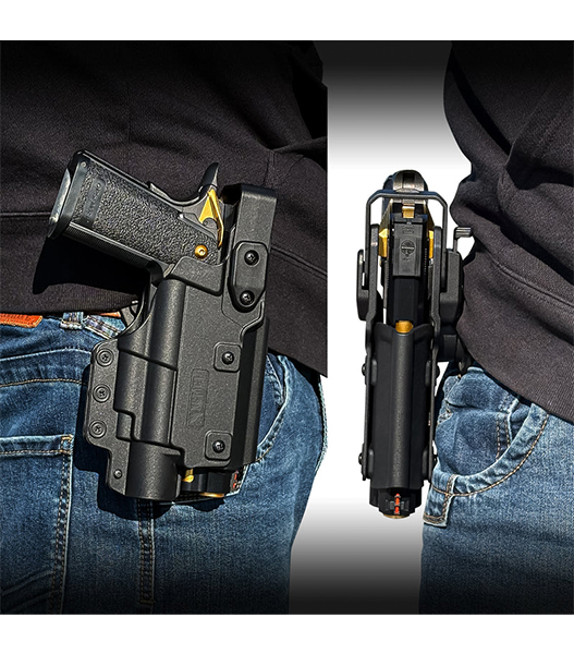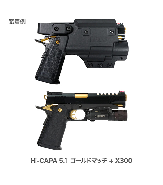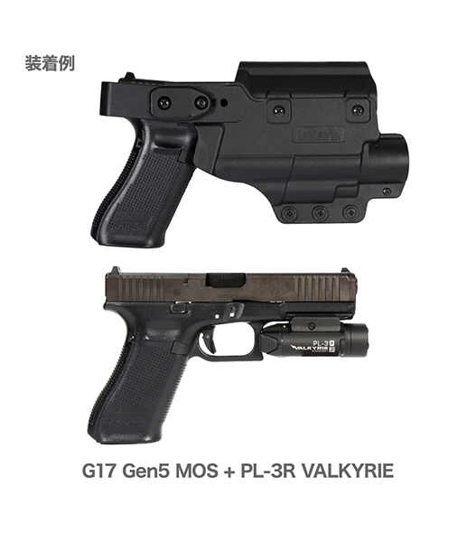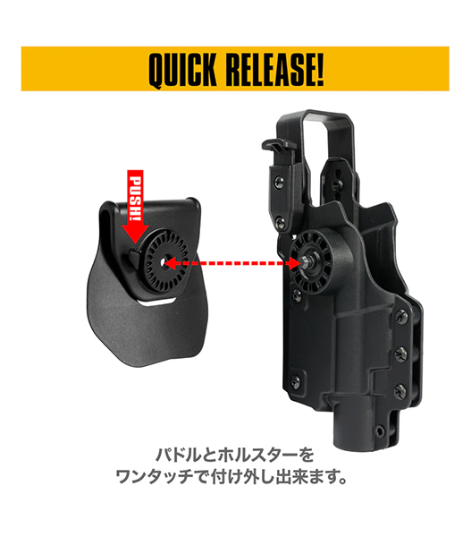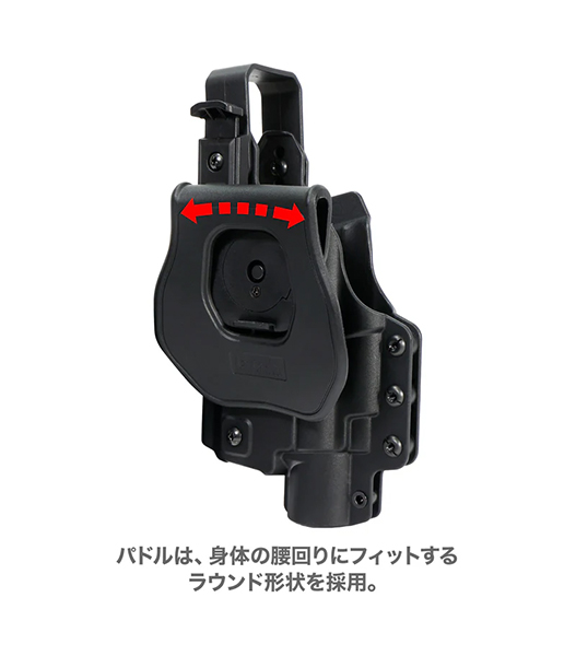 ウェポンライトを装着したハンドガンに“幅広く対応”し、ライトを基準に最適フィットさせて、確実な保持と素早いドローを実現する次世代ホルスター機構 です。