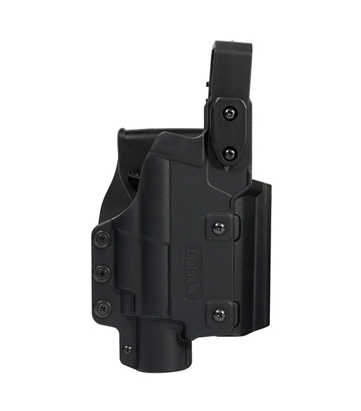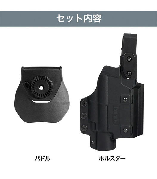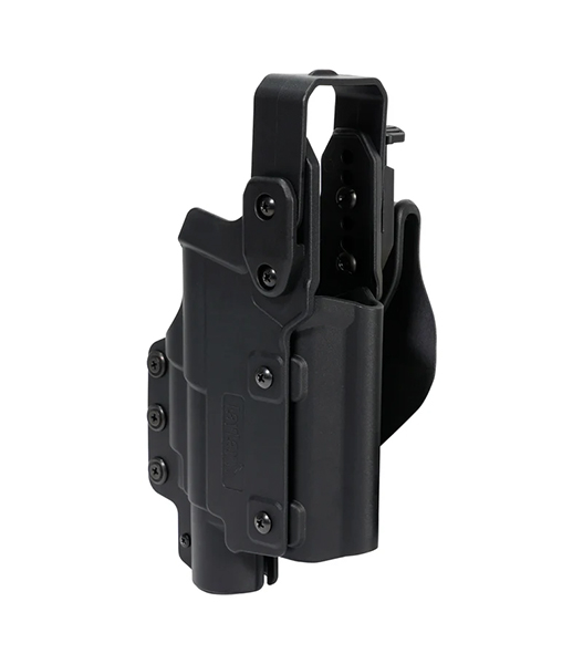 複数メーカーのウェポンライト(X300、TLR-1、PL-3など)をライト形状に合わせて細かく調整し、安全に保持できる 仕組みです。ライトを付けたまま、そのまま収納・ドロー可能。