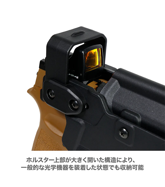 本製品は、各種ウェポンライトを装着したハンドガンに幅広く対応できるLUX System(Light-Universal eXtract System) を搭載した汎用ホルスターです。ライトの形状に合わせて細かくフィッティング可能な調整構造により、ライトを付けたまま確実に保持し、直感的で素早いドローを可能 にします。多機種ハンドガンに対応するユニバーサルデザインと、耐久性の高いポリマー素材により、サバイバルゲームやタクティカルトレーニングなど、ハードな環境でも信頼できる性能を発揮します。さらに、ホルスター上部が大きく開いた構造により、一般的な光学機器を装着した状態でも収納可能。装備の自由度が広がり、より実戦的なセットアップを実現できます。