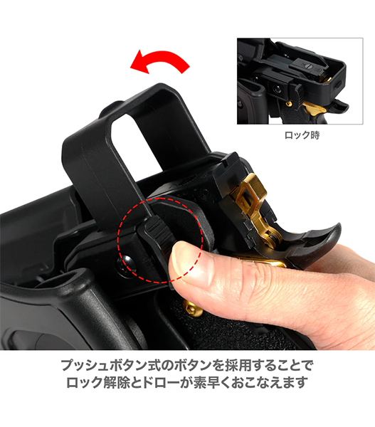 プッシュボタン式ロックと滑らかな内部設計により、ロック解除とドローが 一瞬で完了。ストレスのない素早い抜き撃ちに対応します。