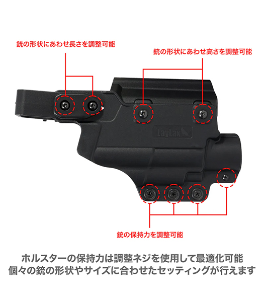 調整ネジにより、ハンドガン × ライトの組み合わせ に合わせてフィットを調整できます。特殊な形状の銃やサイズ違いでも安定保持。