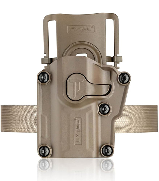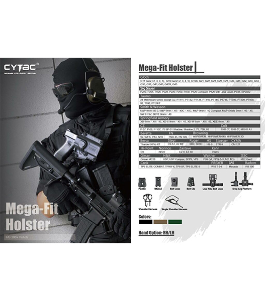 CYTACCYTACメガフィットホルスターは多種のハンドガンにはもちろん、カスタムしたハンドガンにも対応できるホルスターです。本体の5ヶ所のネジをハンドガンにフィットするよう調節します。AMOMAXホルスターアクセサリーに取り付けが可能です。