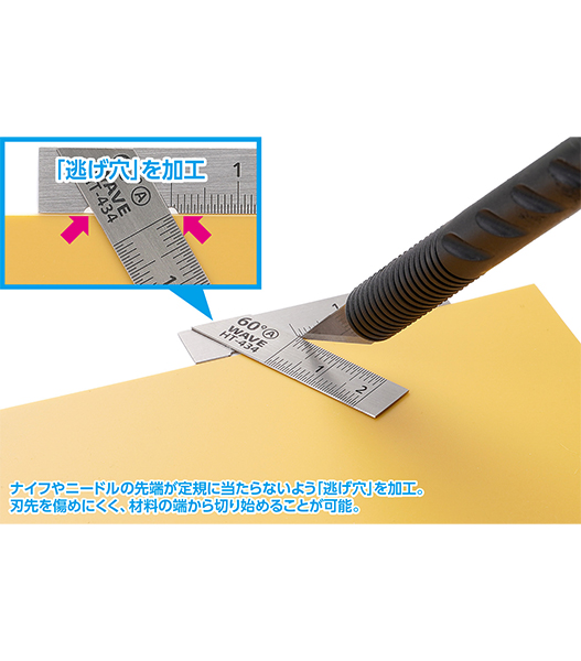 切断作業の際、ナイフやニードルの先端が定規に当たらないよう、交差部分に「逃げ穴」を加工。 刃先を傷めにくく、材料の端から切り始めることが可能。