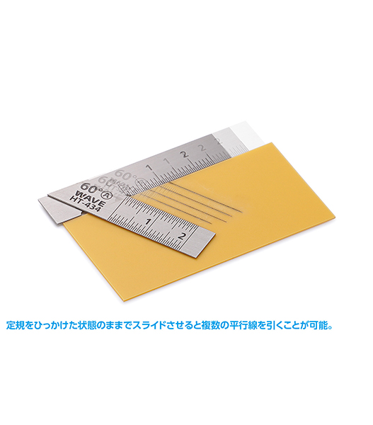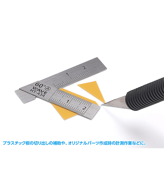 プラスチック板の切り出しの補助や、オリジナルパーツ作成時の計測作業などに便利なT定規です。