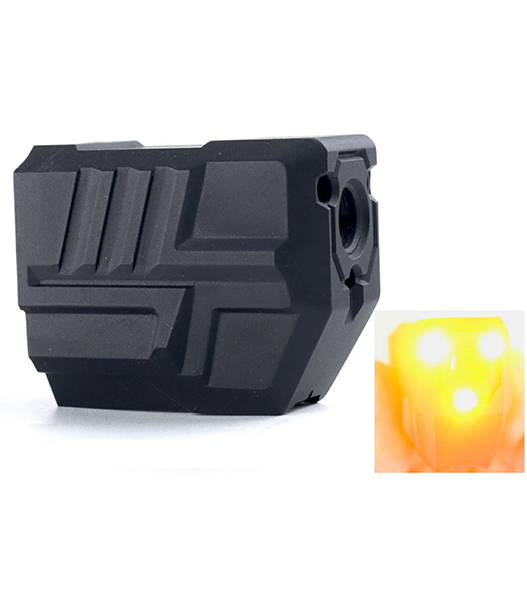 赤と緑、両方の蓄光BB弾を発光させられる従来のトレーサー機能に加え、暖色系LEDによる閃光を発する疑似マズルフラッシュ機能を搭載!