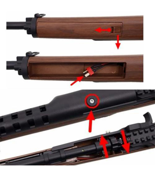 ETU(電子トリガー)採用で、バッテリーは7.4/11.1Vリチウムポリマーバッテリーの使用推奨です。(M4ストックパイプ対応の細・短タイプ T型コネクター仕様対応です)