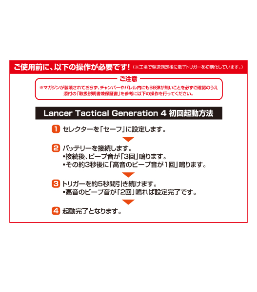 ※マガジンが装填されておらず、チャンバーやバレル内にもBB弾が無いことを必ずご確認のうえ添付の「取扱説明書兼保証書」を参考に以下の操作を行ってください。