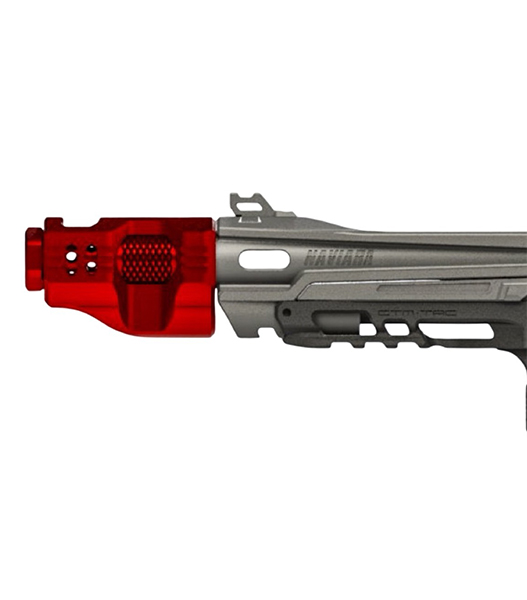 さらに当社では、Hi-Capa用の新型「エクステンデッドレール ブラストシールド」も開発しています。本コンペンセイターと組み合わせることで、これまでにない独創的でアグレッシブ、かつ視覚的インパクトの強いルックスを演出できます。きっと気に入っていただけるはずです。もちろん本コンペンセイター単体での装着も可能で、SUPERLINEおよびFLATLINEスライドにも対応します。また、飛距離性能向上のためにインナーバレルを延長している場合でも、延長分をコンペンセイター内部に収めて外観をすっきり見せることができます。