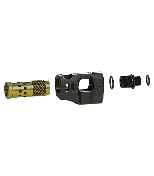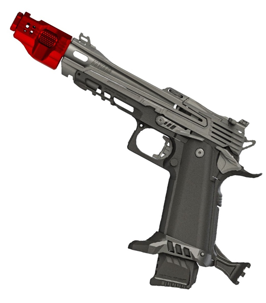 さらに当社では、Hi-Capa用の新型「エクステンデッドレール ブラストシールド」も開発しています。本コンペンセイターと組み合わせることで、これまでにない独創的でアグレッシブ、かつ視覚的インパクトの強いルックスを演出できます。きっと気に入っていただけるはずです。もちろん本コンペンセイター単体での装着も可能で、SUPERLINEおよびFLATLINEスライドにも対応します。また、飛距離性能向上のためにインナーバレルを延長している場合でも、延長分をコンペンセイター内部に収めて外観をすっきり見せることができます。