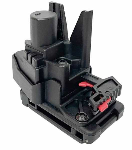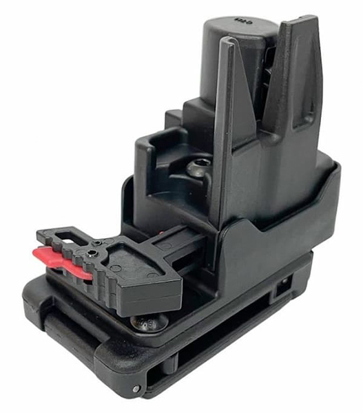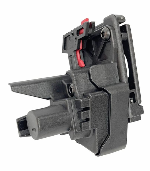 さらに、リリースレバーにも安全機構を搭載。見栄えの良い赤色で塗装されたレバーは、セーフティを同時に押し込んだ場合にのみ銃をリリースできる仕組みです。セーフティが押されていない場合、レバーは動かず、不意の解除(誤脱落)を防ぎます。