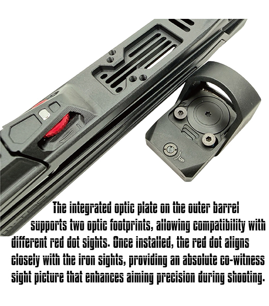 アウターバレルに統合された光学プレートにより、絶対的なコウィットネスの照準像を提供。