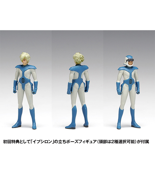 また、初回限定生産版の特典として立ちポーズの「イプシロン」フィギュアも付属します。今回新たに31話以降に登場する傷を前髪で隠した特徴的な頭部とヘルメット姿が再現可能な頭部の2種を追加。どちらもイプシロンを彩る魅力的なパーツとなっています。