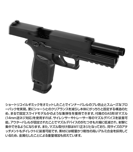 東京マルイ P320フルサイズ用のメタルアウターバレルです。ショートリコイルギミックをオミットしたことでインナーバレルのブレ防止とスムーズなブローバックを実現。更にシャーシとのクリアランスを減らし本体にがっちりと固定(※)する構造のため、まるで固定スライドモデルかのような集弾性を獲得できます。付属のSAS形状マズル(14mm逆ネジ対応)を使用すれば、サイレンサーやトレーサー等のマズルデバイスを装着可能。アウターバレルが固定されたことでマズルデバイスのがたつきも大幅に低減され、射撃に集中できるようになります。また、マズル取付け部はM11正ネジとなっており、同サイズのアタッチメントもダイレクトに装着可能です。素材には軽量かつ剛性の高いアルミ合金を採用しているため、金属化したことによる重量増加も抑えています。