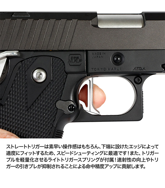 東京マルイ 電動ガン ハンドガンタイプ ハイキャパE専用のストレートトリガーとライトトリガースプリングのセットです。ストレートトリガーは素早い操作感はもちろん、下端に設けたエッジによって適度にフィットするため、スピードシューティングに最適です!また、トリガープルを軽量化させるライトトリガースプリングが付属!速射性の向上やトリガーの引きブレが抑制されることによる命中精度アップに貢献します。