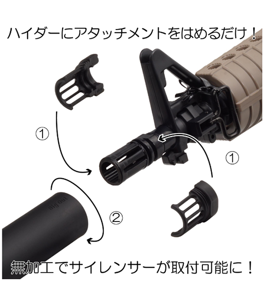 ハイダーの先端にアタッチメントを挟みこむだけで、サイレンサーが取付可能になります。