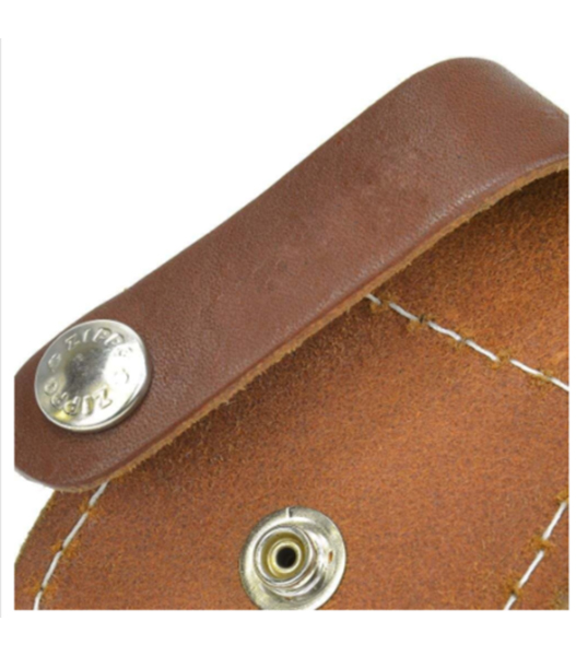 レザーポーチのフタとベルトループはともにスナップボタン式で簡単に開閉可能。