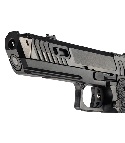 BT-SAND VIPER CO2GBBは、このTTI SAND VIPERの魅力をCO2ガスガンとして忠実に再現。実銃同様ドットサイトを搭載出来るスライド上部は、金属製のプレートをインサート成型することで強度を確保。また、ドットサイトが無くてもねらい撃てるように、オリジナルのリアサイト付きスライドカバー(+オプティックプレート3種類)と集光フロントサイトが付属。BKモデルはマガジンボディもブラック