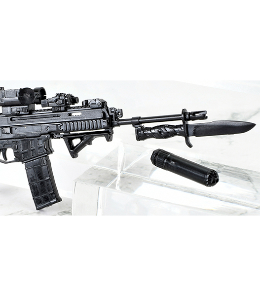 サプレッサーは各銃口部に取り付け可能。14インチバレルモデルには専用銃剣が装着可能です。