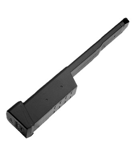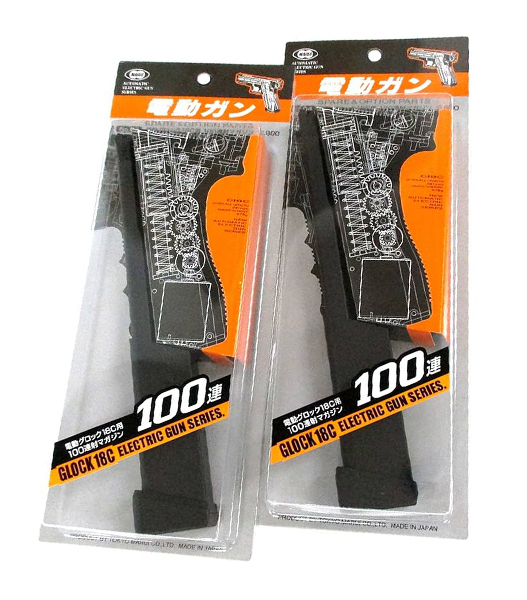東京マルイ電動ハンドガンシリーズ G18C(グロック18C)用の多弾数100連射ロングマガジン。装着するとグリップの下に大きく張り出すロングマガジンスタイルになります。