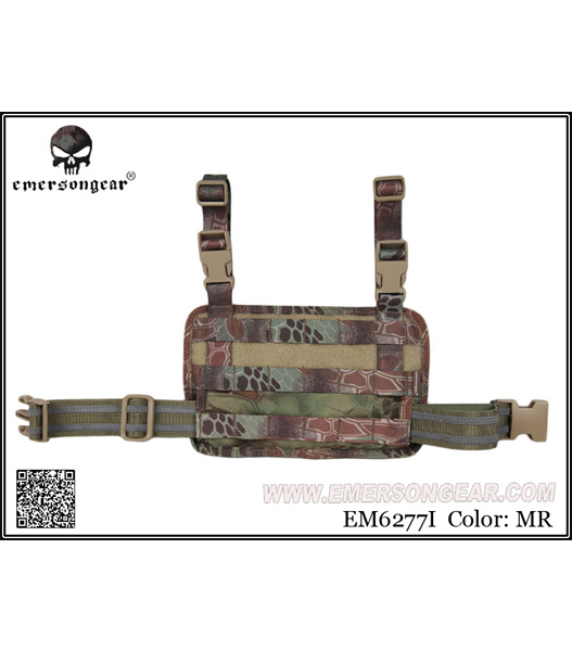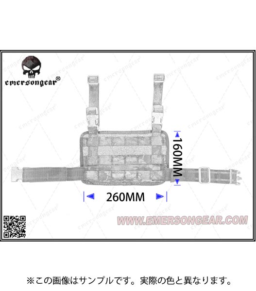 縦×横に3×6のMOLLEウェビングが配置されたレッグパネルです。 広範囲にウェビングがあるためマガジンポーチやツールポーチなど、小型ポーチ類 を任意に装着することができます。上部にはベルクロがありIDや好みのパッチの貼付が可能。 装着はベルト固定用の2つのストラップと大腿部のストラップの3点で固定するため、 激しい動きをしてもズレや脱落が起こりにくいデザインとなっています。 材質は引き裂き・摩耗に強い耐久性に優れた500Dナイロンを使用しています。サイズ:約26×16cm