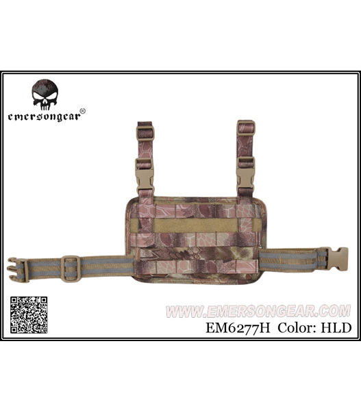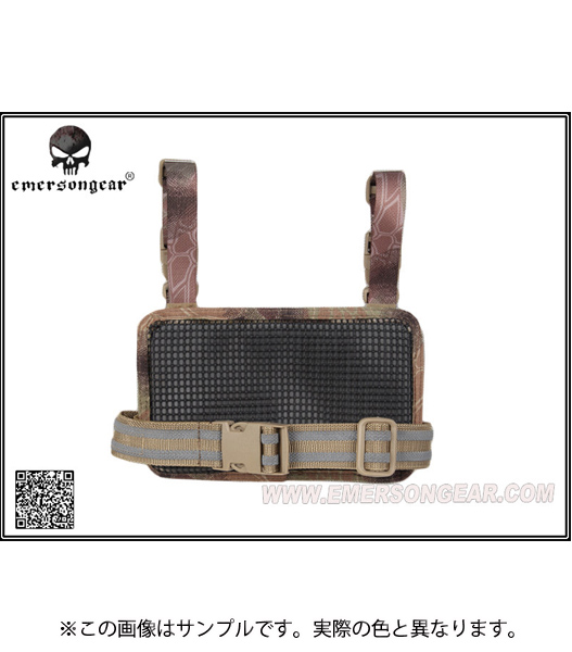 縦×横に3×6のMOLLEウェビングが配置されたレッグパネルです。 広範囲にウェビングがあるためマガジンポーチやツールポーチなど、小型ポーチ類 を任意に装着することができます。上部にはベルクロがありIDや好みのパッチの貼付が可能。 装着はベルト固定用の2つのストラップと大腿部のストラップの3点で固定するため、 激しい動きをしてもズレや脱落が起こりにくいデザインとなっています。 材質は引き裂き・摩耗に強い耐久性に優れた500Dナイロンを使用しています。サイズ:約26×16cm