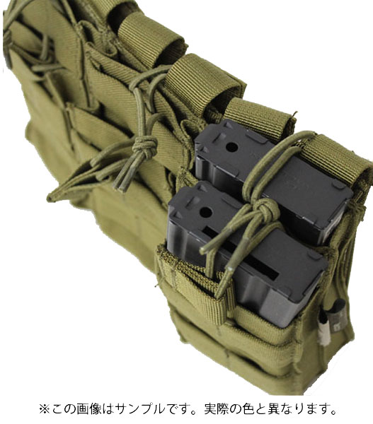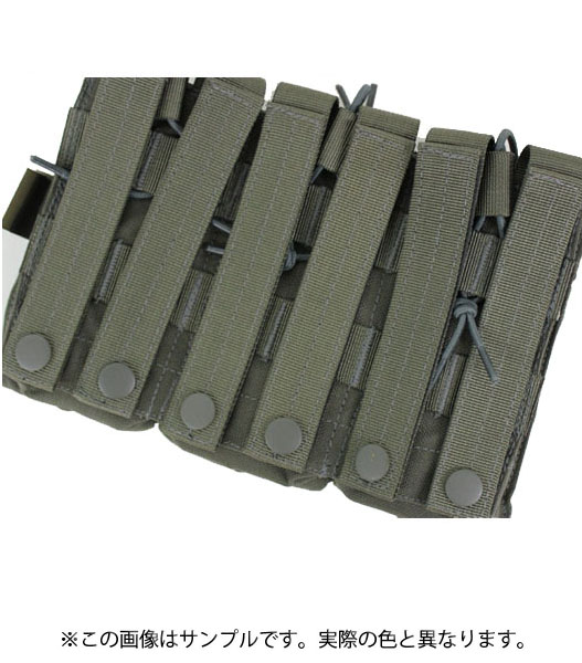コーデュラナイロン使用。M4系対応。マガジンポーチが2つ重なり、それが3連、計6本のマガジンが入ります。実銃サイズに近いためきつめになっています。マガジンは前部から入れるようにしてください。