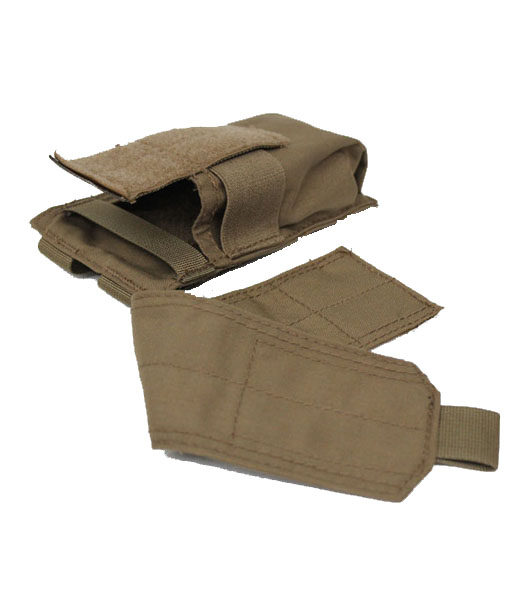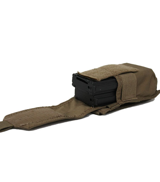 マガジンが2本入ります。上ふたの高さをベロクロテープで調節できるため、M16より長めのマガジンも収納可能です。ポーチのサイドにゴムがありマガジンを固定するため、ふたを外しての使用もできます。コーデュラナイロン製。