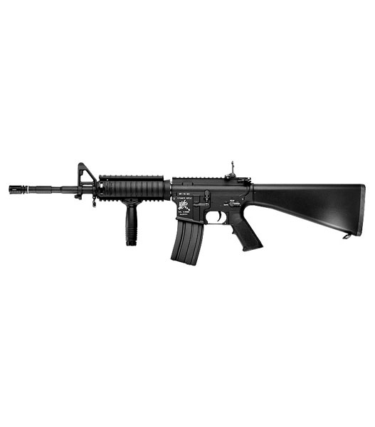 アメリカ軍特殊部隊用に様々な装備を開発してきたナイツ・アーマメント社のM16、それがストーナーズ・ライフル「SRシリーズ」です。7.62mm×51弾を使用するナイツ社のM16・SR-25に対し、5.56mm×45弾を使用するSR-16は、コルト社のM4A1カービンに相当するモデルと言えます。素材の選定からパーツ精度までこだわりぬいて作られたSR-16は、コルト社の通常軍用モデルとは一線を画する仕上がりでした。特殊部隊の精鋭達から尊敬と畏怖をこめて「ブラックナイツ(=黒騎士)」と呼ばれるこのモデルを、風格ごと電動ガンで再現しています。《主な特徴》・金属製R.I.S.を装備:幅20mmのマウントレイルを4面に配した剛性の高いアルミダイカスト製のR.I.S.に、バーチカル・フォアグリップとハンドガードパネルが付属します。・ナイツのロアーフレームを完全再現:ストック結合部の補強など、コルト社のロアーフレームとの違いをリアルに再現。マットブラックにナイツ社のオリジナル・ロゴマークを配した特別な仕上がりとなっています。・各種光学機器に対応:アッパーフレーム上部のマウントレイルには、レイル幅20mmに対応した各種光学機器を装着することができます。・各種マズルオプションが装着可能:コンペンセイターを取り外せば、サイレンサーなど14mm逆ネジ仕様のマズルオプションを取り付けることができます。・手軽にホップ調整:チャージングハンドルを引くと連動してポートカバーが開き、ダミーボルトも後退。ダイヤル式のホップダイヤルですぐにホップ調整が行なえます。・スチールプレス製マガジン:装弾数68発、M16用ノーマルマガジンが付属。※次世代電動ガンとはマガジンの互換性がありません