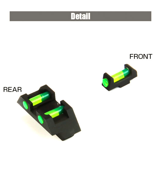 LAYLAX●周囲の光を集めて発光●集光アクリル採用サイト●フロント&リアのセット東京マルイ G18C ファイバーオプティックサイトFIBER OPTIC SIGHT for TOKYO MARUI G18C自然光など、周囲の光を集めて発光する集光アクリルを採用したサイトです。φ2.4mmの集光アクリルを搭載し、ベース素材には高強度なジェラルミン材からオール切削加工にて製作装着した際、銃の雰囲気を壊さない外観デザインに仕上げています。フロント、リアサイト共にグリーン色の集光アクリルを採用。 通常時や薄暗い場所でのシチュエーションで視認性をアップし絶大な威力を発揮します!(対応機種)