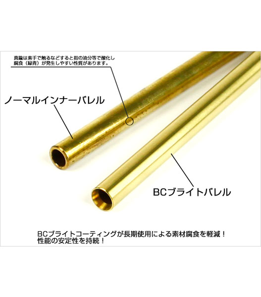 ●コストパフォーマンスに優れながらも、日本製素管&内径φ6.05mm寸法公差±0.01mmを持つ高精度バレル!●BCブライトコーティングが長期使用による素材腐食を軽減&性能安定性を持続!GUNのコンセプトとは“遠くの標的に狙いを定め、射止める”ことである。言ってしまえば簡単ですが、現実的にそう単純な事ではありません。エアーソフトガンも実銃と同様に言える事ですが、各パーツの精度やアッセンブリ時の作動性、弾丸(BB弾)の重量や寸法精度の均一性、パワーソースとのマッチングなど様々な要素が複雑に絡み合い、それぞれがバランスよく整合性を保つ事で初めて優れた結果が得られます。バレルはその様々な要素の中でもGUNの肝と言える部分であり、命中精度や飛距離を左右する重要なパーツでもあります。このアイテムは、コストパフォーマンス&硬度・強度バランスの良いブラス(真鍮)素材を採用する事で、リーズナブルな価格設定を実現!