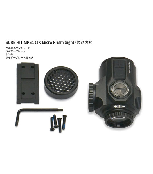 SURE HIT MPS1(1X Micro Prism Sight)は小型軽量の等倍プリズムサイトです。耐衝撃性800Gに優れ強力なリコイルにも耐える設計です。ナイトビジョン対応(N1/N2)の10段階輝度調整機能。Motion Activation機能によりレティクル点灯後、約5分間の動作が無い場合には自動で消灯になり、再度動作が検知されるとレティクルが自動で点灯します。※約8時間動作が無い場合は完全シャットダウン。脱着可能なライザープレートが付属致します。使用する銃、お好みの高さにあわせて本体の高さ調整が可能です。また、レンズの反射を防ぎ、BB弾からの被弾を防ぐハニカムサンシェードが付属致します。