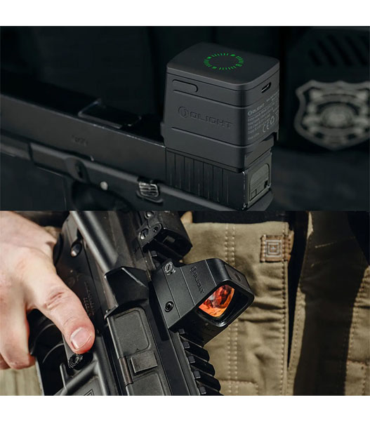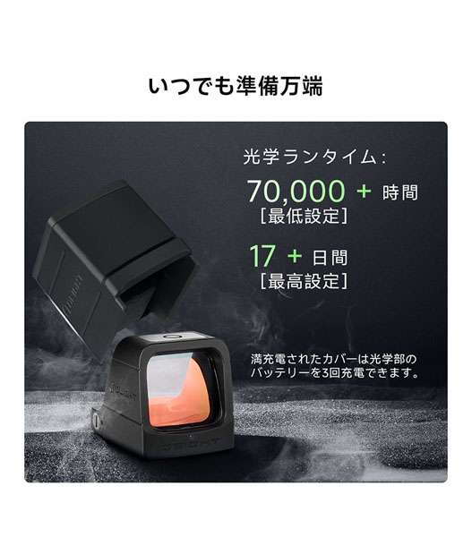 カバーは光学機器を3回充電可能で、光学機器自体は最低輝度設定で70,000時間以上、最高輝度設定で17日間以上連続動作します。